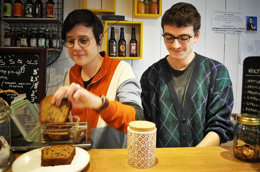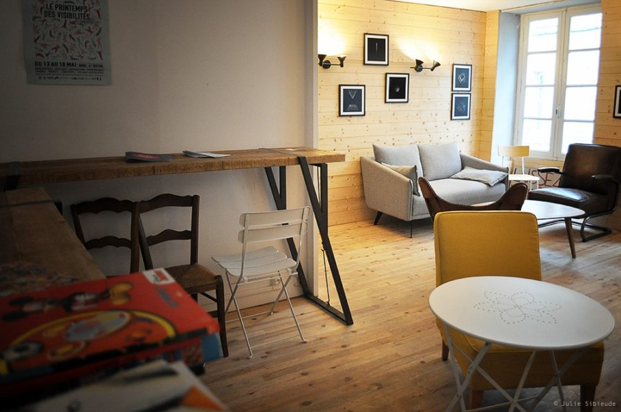 Au-delà d’une simple librairie, Célia Prot a réussi à créer un lieu convivial, véritable espace d’échange, de partage et de vie, comme le soulignent Patricia et Laurent, habitués des lieux : « On y fait tout le temps de nouvelles rencontres, on y retrouve aussi les habitués et on y découvre des pépites littéraires qu’on ne trouverait nulle part ailleurs. Célia nous accueille avec sa générosité et son humour, ses conseils sont toujours de qualité et la bière est bonne. » La patronne et ses associées regorgent d’idées pour faire vivre et vibrer au quotidien la librairie-café. Au rez-de-chaussée, les livres côtoient une sélection de gourmandises préparées maison par La Pin-Up Givrée ; un tableau indique le nombre de cafés suspendus disponibles – et ils sont nombreux ; une vitrine de bocaux consignés propose des plats 100% bio, cuisinés et fournis par le restaurant Le Bocal Gourmand situé aussi à Niort, avec qui la librairie a mis en place un partenariat. Hermann Cadiou, le gérant, raconte : « J’ai rencontré Célia au Club Cigales L’Evaîe et j’ai tout de suite adhéré à son projet que je trouve méritoire et courageux. Quand Le Bocal Gourmand a ouvert ses portes, je lui ai proposé ce principe de vitrine à bocaux. Elle a accueilli l’idée avec entrain, et depuis, je lui fournis des plats 100% bio, cuisinés avec des produits de saison sélectionnés en circuits courts. Nous partageons des valeurs communes, ce partenariat est très positif. » A l’étage, une salle boisée accueille les lecteurs cherchant un peu plus de calme ; elle est également mise gracieusement à disposition des associations, comme par exemple Aides, le Planning Familial, SOS Homophobie, le collectif Marche pour le Climat ou Soliniort, le projet d’épicerie solidaire. En dehors des horaires habituels d’ouverture, la librairie propose des lectures de poésie, du théâtre en petit format, des concerts, des café-philo, des rencontres d’auteurs, des temps de conférences et de débats, des projections, des cafés de papas…