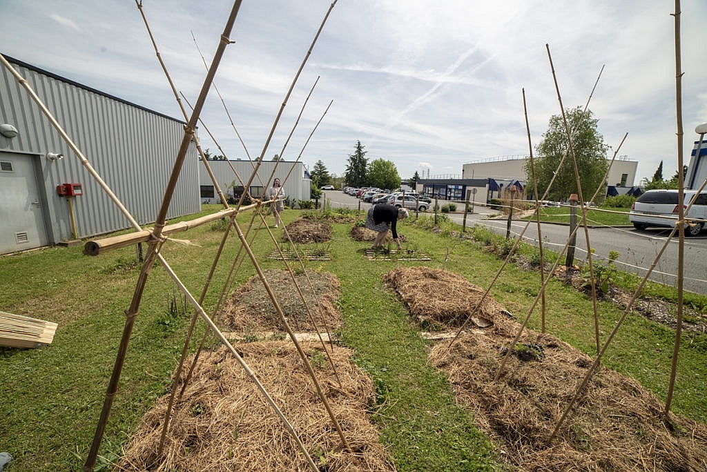 Une petite dizaine de salariés volontaires ont manifesté leur intérêt pour le projet, se sont emparés des outils de jardinage et des conseils de la permacultrice pour faire sortir de terre différents espaces : des buttes de culture, une haie, une friche de fleurs sauvages et un compost. Delphine fournit les plants de fleurs et de légumes. Les salariés sont invités à venir sur leur temps de pause ou de déjeuner pour planter, entretenir le jardin ou tout simplement s’asseoir sur l’herbe pour manger leur sandwich en contemplant les abeilles charpentières. Evelyne, qui travaille dans l’école supérieure voisine, a été le premier soutien de Delphine. « J’ai grandi à la campagne et maintenant je vis en appartement. Le jardin me manque terriblement. Alors s’occuper de notre jardin collectif est devenu vital pour moi. Je viens là tous les jours. Cela me ressource. »