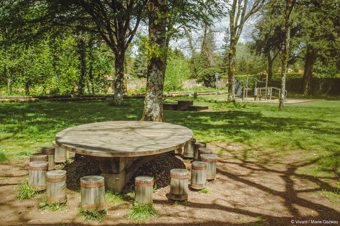 Notre menuisier communal, formé et bien équipé, fabrique ensuite du mobilier urbain comme des bancs, des tables, des caillebotis pour un cheminement doux à travers les zones humides, des bardages de bâtiments communaux, des hôtels à insectes, des structures de jeux pour enfants, des parquets, des bornes pour empêcher les voitures de stationner. Il a également réalisé les aménagements intérieurs de la maison de la santé, des écoles où toutes les étagères et cloisons sont désormais en tilleul ou merisier local, garanti sans substance toxique.