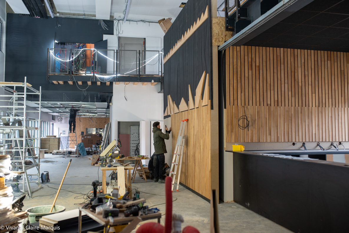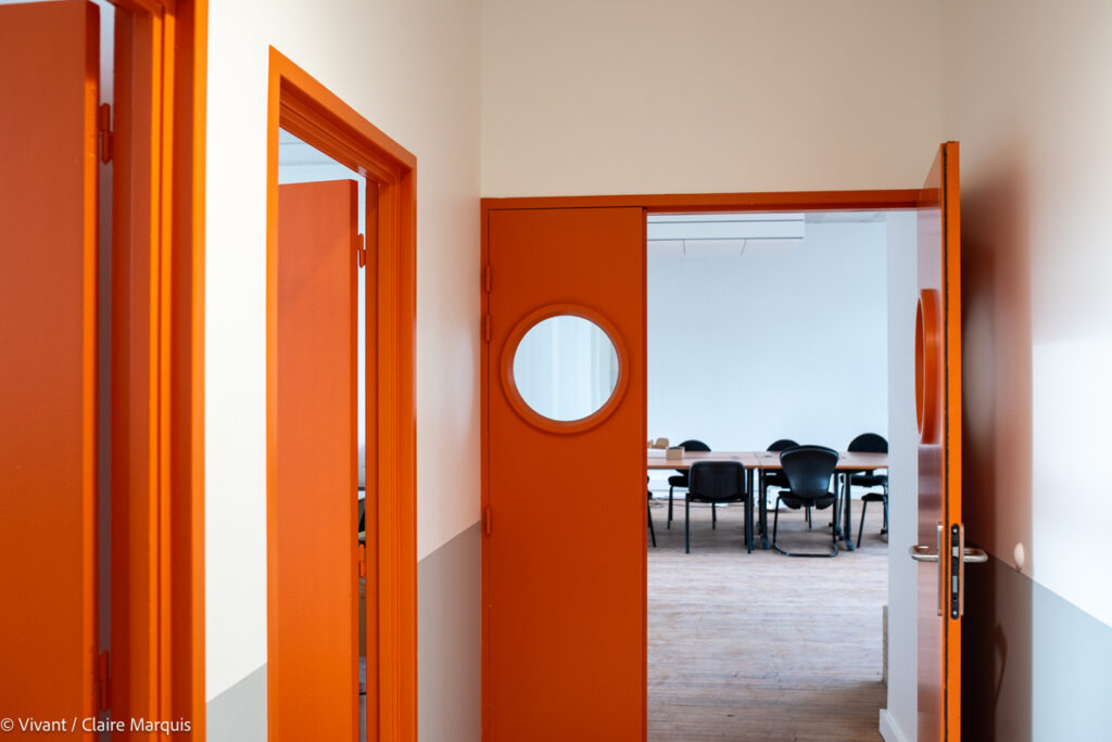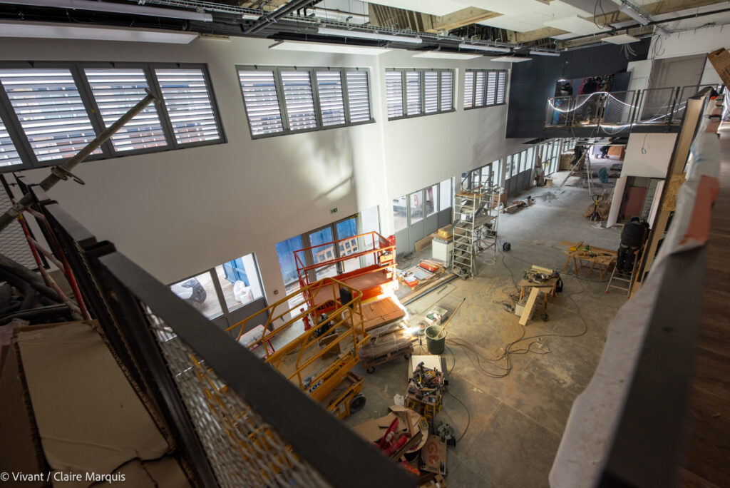 L’ancienne salle de bal des pompiers est devenue une grande salle de réunion, avec le même plancher, remis à neuf. Les dalles de plafond sont issues du réemploi, comme les éléments de sécurité obligatoires signalant les issues de secours. Les garde-corps de la mezzanine de l’espace restauration-agora ont été réalisés à partir des clôtures de l’ancienne caserne.