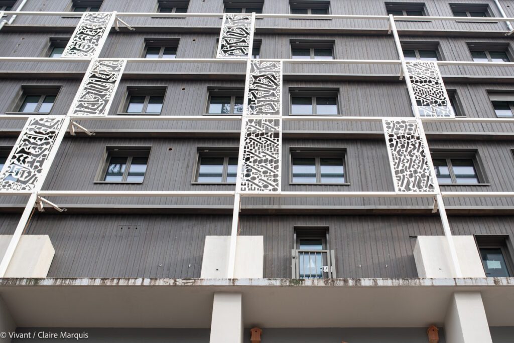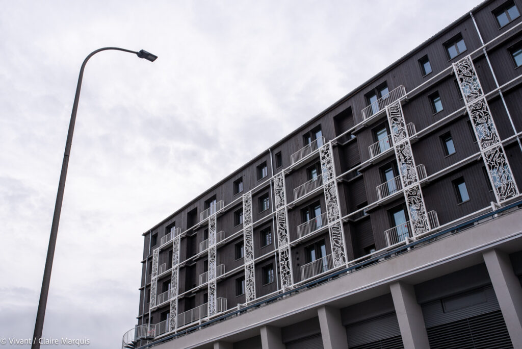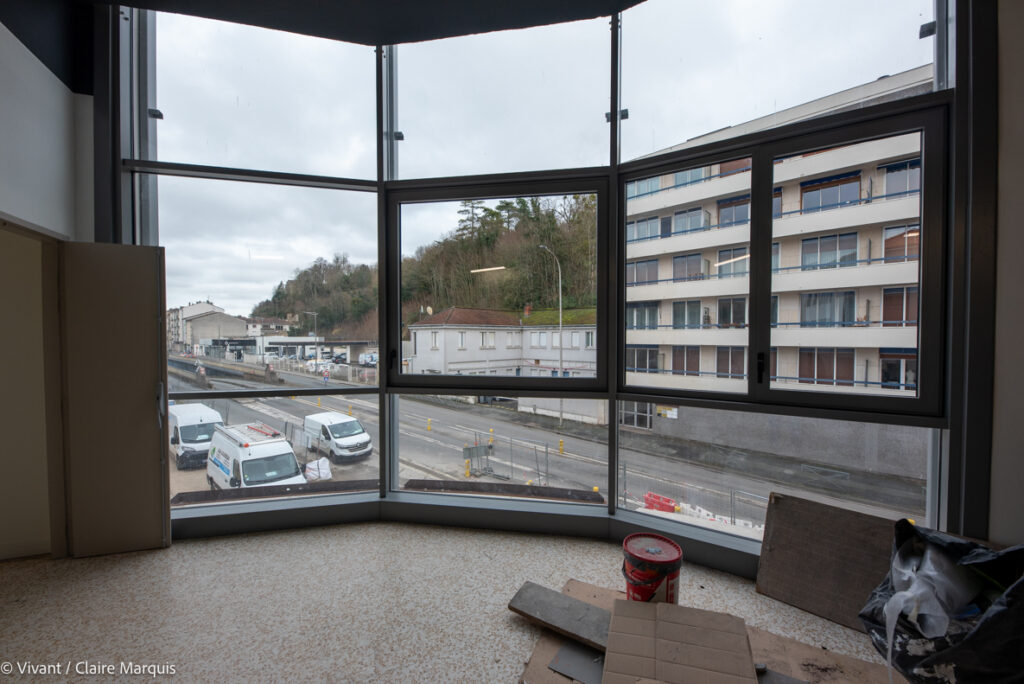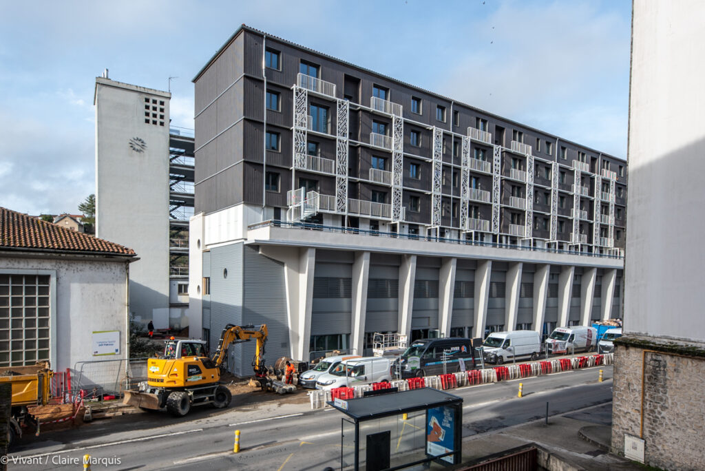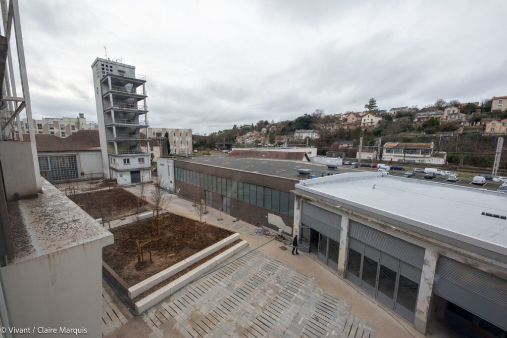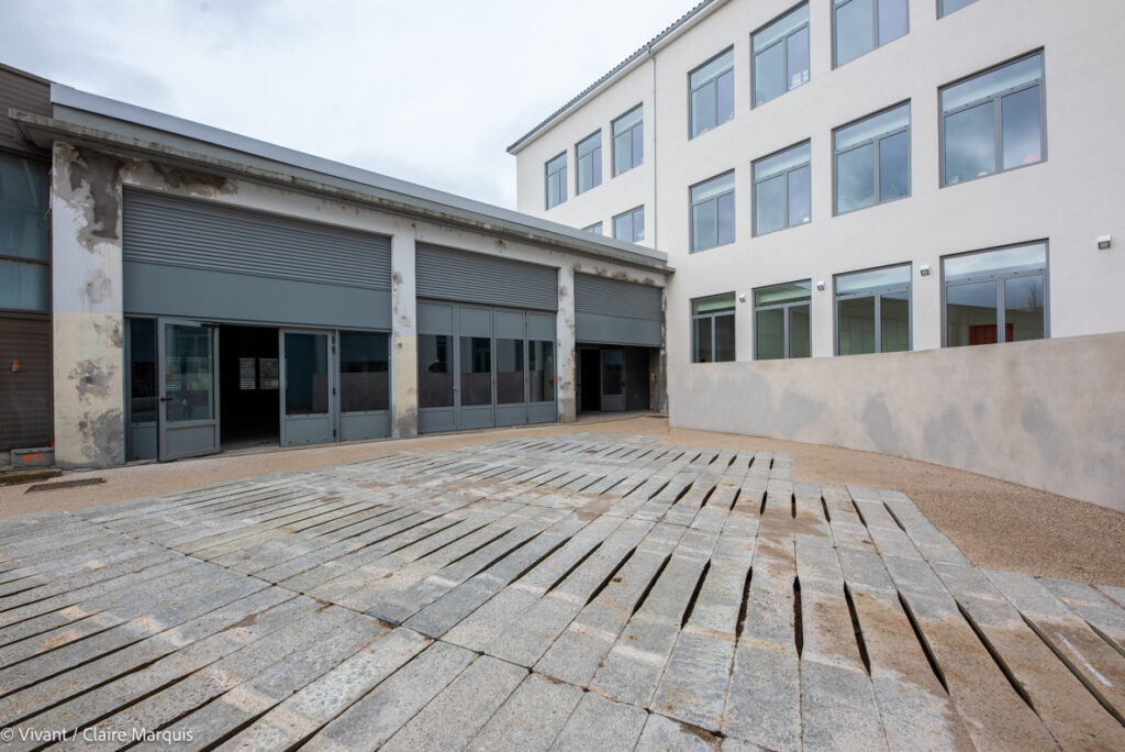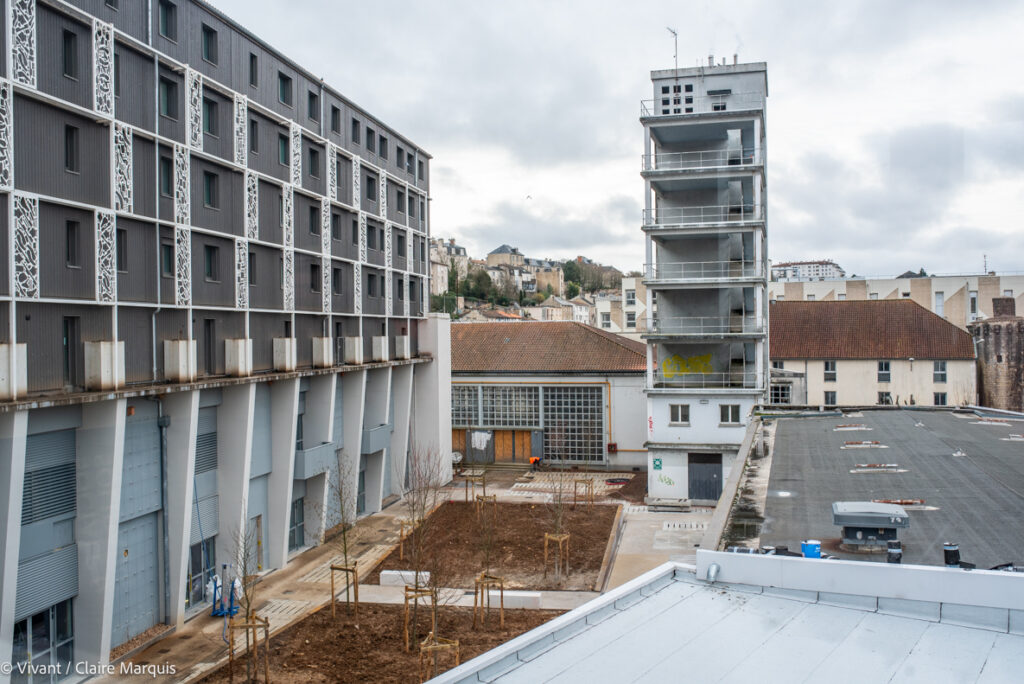 Le choix a été fait de garder la destination d’origine des espaces : les anciens logements des pompiers restent des logements (6 hébergements à vocation sociale et 164 lits pour l’auberge de jeunesse), les bureaux aussi gardent leur vocation. 12 structures sont actuellement en train de s’y installer. La remise, où étaient garés les véhicules de secours, accueille désormais le resto-bar-agora, et les anciens ateliers de Grand Poitiers deviennent 1000m² d’espace pour des acteurs de filières écologiques et créatives. L’isolation a été renforcée par l’extérieur, avec de la paille hachée soufflée (une technique développée par l’entreprise locale Ielo), et un bardage bois.