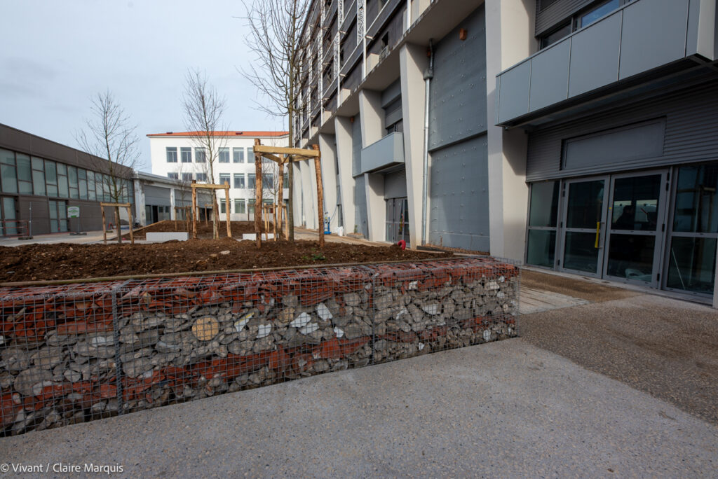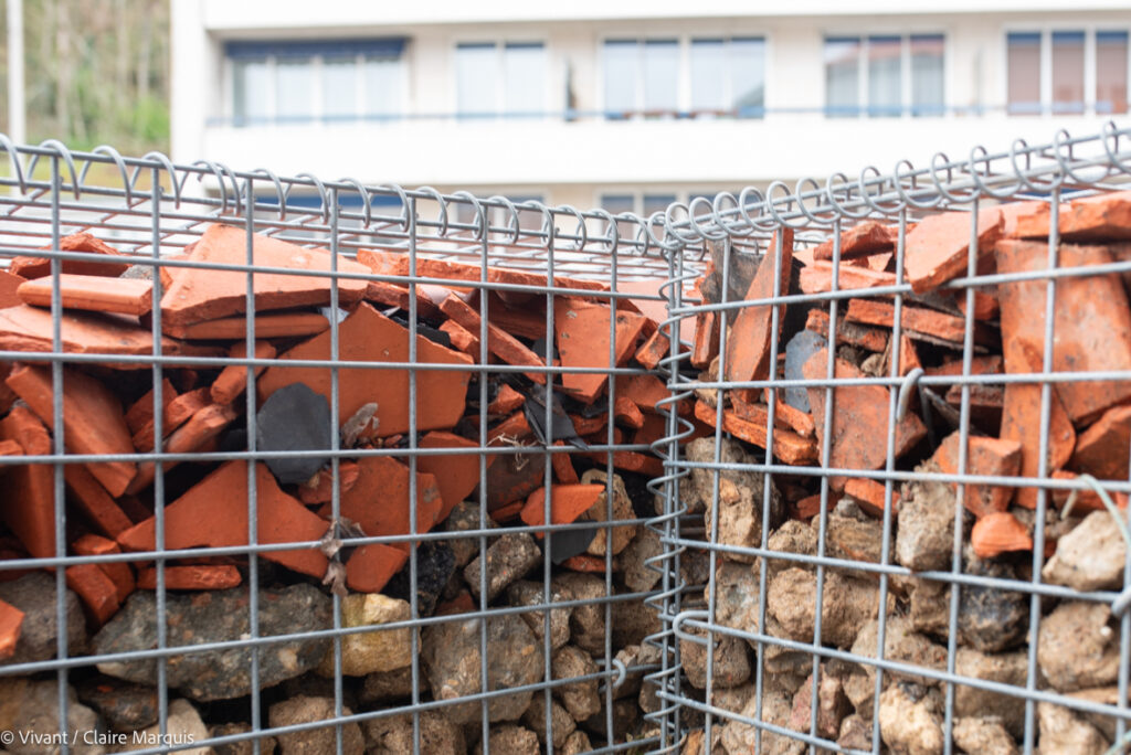 Des gabions ont été réalisés avec des matériaux issus du chantier de déconstruction. Ils pourront servir de refuge à la biodiversité, tout comme les nichoirs creusés directement dans les façades.
