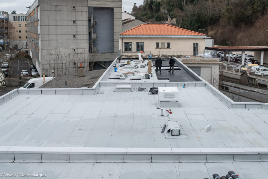 Le chantier est aussi exemplaire au niveau de la gestion de l’eau. L’usage de la dépose soignée et du réemploi a permis d’économiser 20800 m3 d’eau (plus de 8 piscines olympiques). Des bassins de récupération des eaux de toiture sont enterrés sous les espaces verts, avec un trop plein se déversant dans une autre cuve, réserve d’eau pour l’été, avant de rejoindre le réseau collectif.
