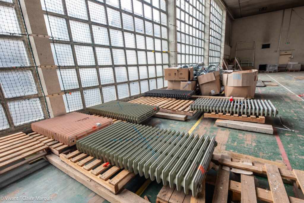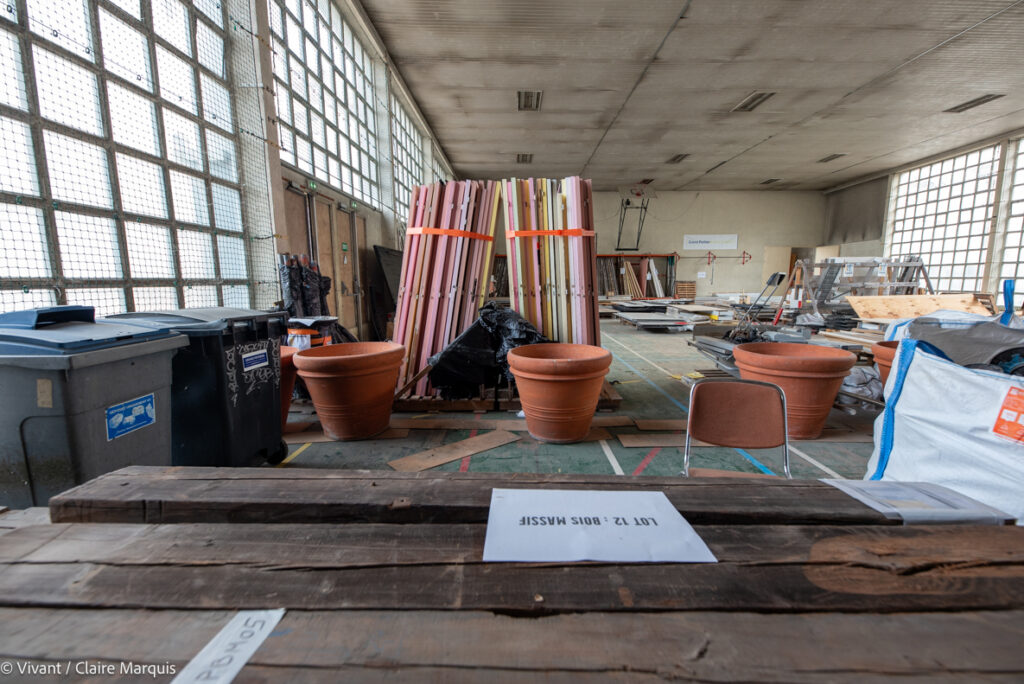Stockés dans le gymnase voisin prêté par la communauté urbaine de Grand Poitiers, les matériaux réutilisables issus de la dépose soignée des bâtiments de l’ancienne caserne ont été identifiés en amont, répertoriés et rangés par lots (menuiseries intérieures, lettrages, planchers, sanitaires, électricité, ventilation, luminaires…). 90 références ont ainsi été réemployées, soit 87 tonnes in situ. Si l’on prend en compte la valorisation de matériaux issus d’autres chantiers, ce sont au total 180 références et 400 tonnes qui ont été sauvées des bennes. Soit 260 tonnes de CO2 évités.