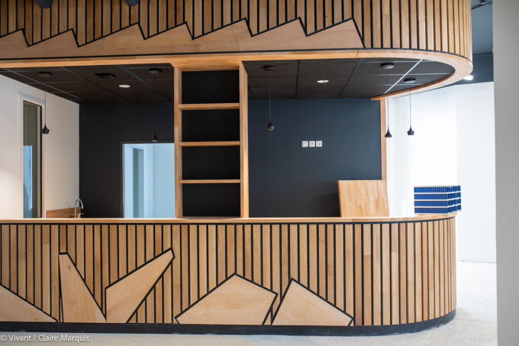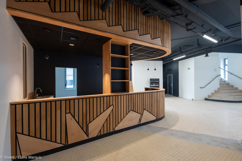 Lieu central, la rotonde distribue la circulation sur tous les espaces du lieu. La banque d’accueil a été réalisée en bois de récupération. Les modules géométriques sont issus des anciens escaliers en hêtre.