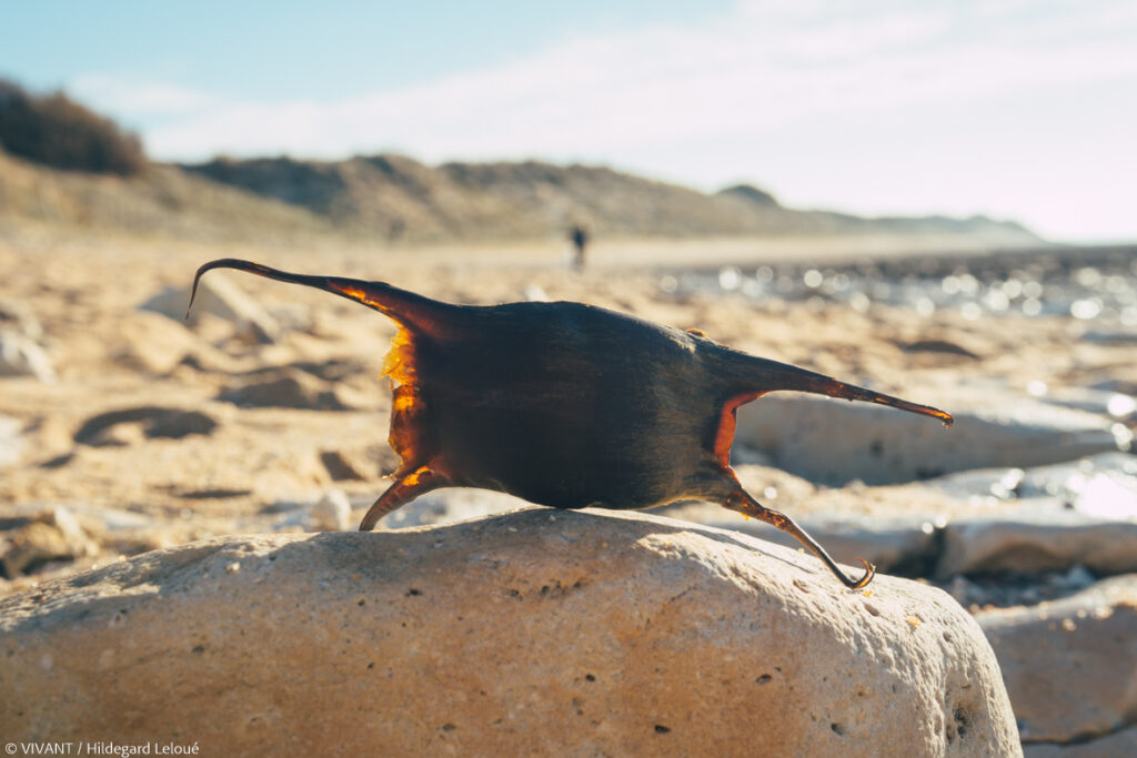 On les dirait sorties d’un autre monde, avec leur coque noirâtre en forme de scarabée, surmontée de quatre pointes émaciées. Souvent mêlées aux algues ou aux touffes de végétation bordant les dunes, les capsules de raies échouées sur la plage de Matha, à l’Île d’Oléron, ne s’offrent qu’aux regards attentifs. “Les raies pondent sous l’eau et fixent leurs œufs dans le sable, entourés de cette sorte de capsule protectrice. Une fois l’œuf éclos, la capsule se détache et elle est charriée par la mer sur le rivage”, expose Brigitte, retraitée au regard espiègle, sous son cache-oreille imprimé léopard. Elle et son amie de longue date Françoise, 64 ans, bravent les températures hivernales pour participer à une opération collective de récolte de capsules. “C’était dimanche foot à la maison, alors j’ai eu besoin de prendre l’air”, plaisante Françoise avant d’ajouter, plus sérieuse : “On est des amoureuses du territoire, alors cet environnement, on a envie de le protéger, d’aider à valoriser ce qui peut l’être”.