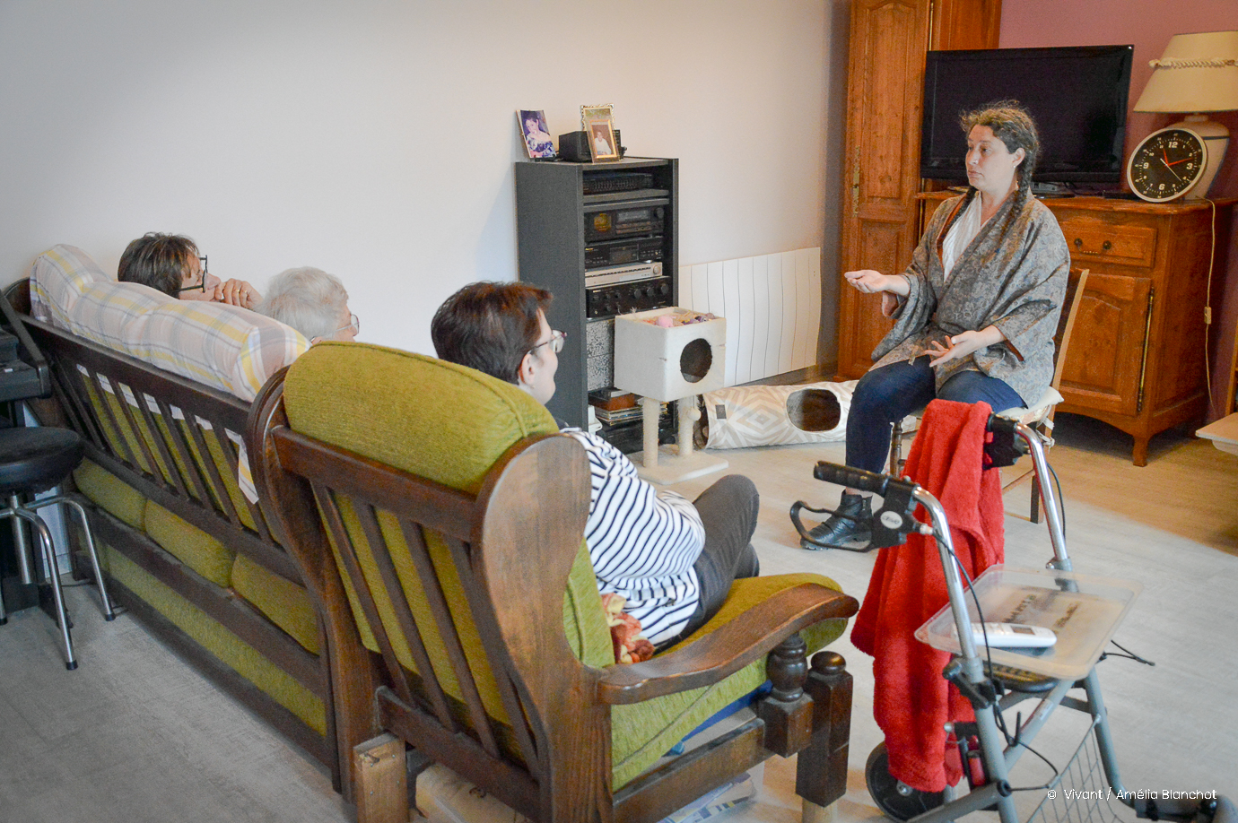 Dans la pièce de vie de la maison de Villars-les-Bois, la mère et sa fille s’installent sur leur canapé aux côtés de la visiteuse bénévole. La conteuse s’assoit sur une chaise face à elles. « Merci beaucoup de nous avoir ouvert votre porte », annonce-t-elle en préambule. Le silence s’installe, puis Laureline Clair débute une histoire de roi et de grenouille. Sourire au coin des lèvres, l’auditoire est captivé. Parfois, des rires éclatent. Arrive la fin du récit. « Vous voulez une autre histoire ? », interroge la conteuse. « Oh bah oui ! », répond la bénéficiaire du tac au tac, avec enthousiasme. Cette fois-ci, il s’agit d’une fratrie, de mort, de vie. Après la chute, la narratrice se fait applaudir. Le public accepte volontiers d’écouter un dernier conte « venu des montagnes turques », dans lequel un enfant très pauvre réussit, après moultes péripéties, à devenir prince. « J’ai beaucoup aimé, ça change des activités habituelles qu’on peut faire avec l’ADMR. Quand on m’a proposé j’ai tout de suite dit ‘‘oui’’ », confie l’adhérente, qui prend son déambulateur pour raccompagner la conteuse : « Merci encore, vous revenez quand vous voulez ! »