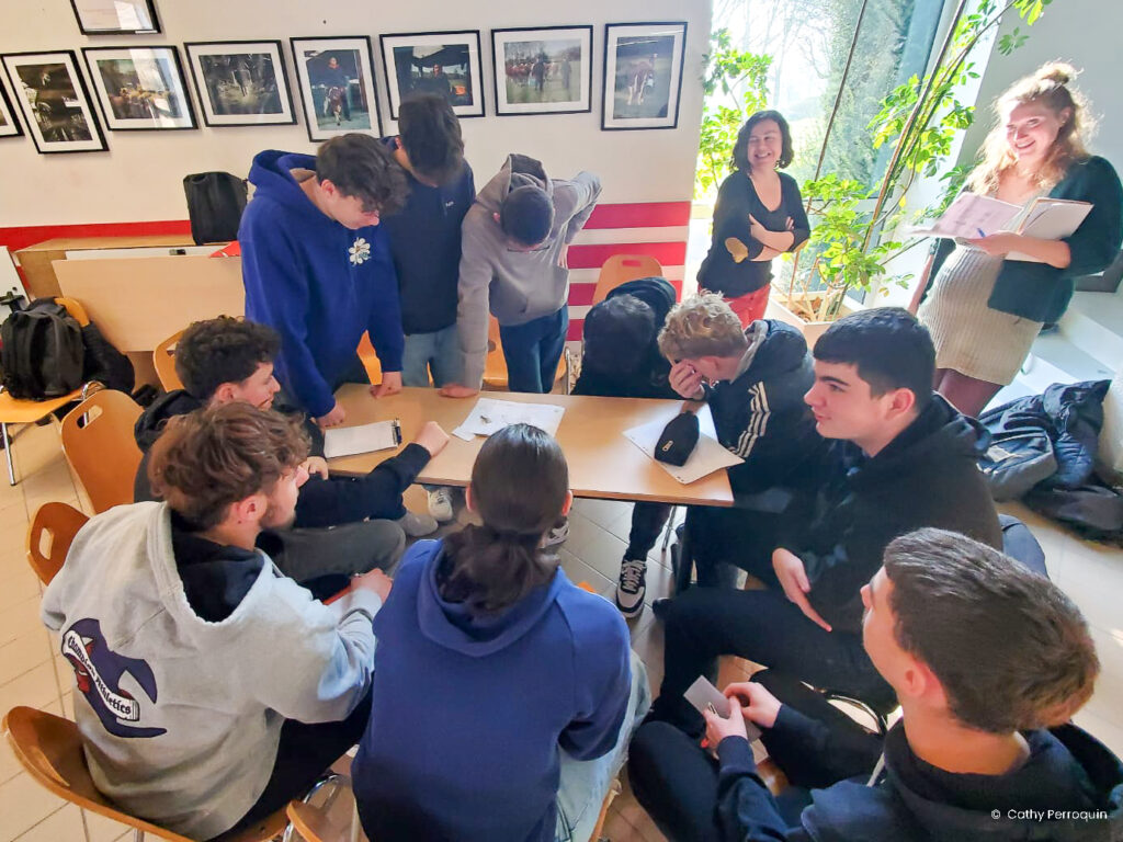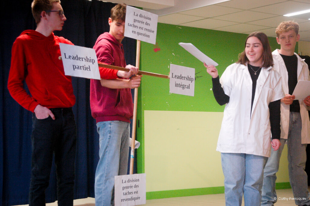 Les adolescent·es se succèdent par groupes de trois ou quatre pour présenter des scénettes dans lesquelles ils et elles incarnent tour à tour des agricultrices retraitées, en activité, ou encore en formation. Sous forme ludique, ils font passer les messages qui les ont marqué·es au cours de leur semaine d’immersion dans les problématiques féministes en agriculture. Nous sommes au lycée des Sicaudières à Bressuire, où la professeure d’éducation socioculturelle Cathy Perroquin s’est mobilisée pour monter cette action : « Ils ont étudié des documents, écouté des podcasts, rencontré un chercheur, une journaliste et échangé avec des agricultrices du territoire.» De quoi poser un nouveau regard sur le monde professionnel et les inégalités de genre qui les entourent.