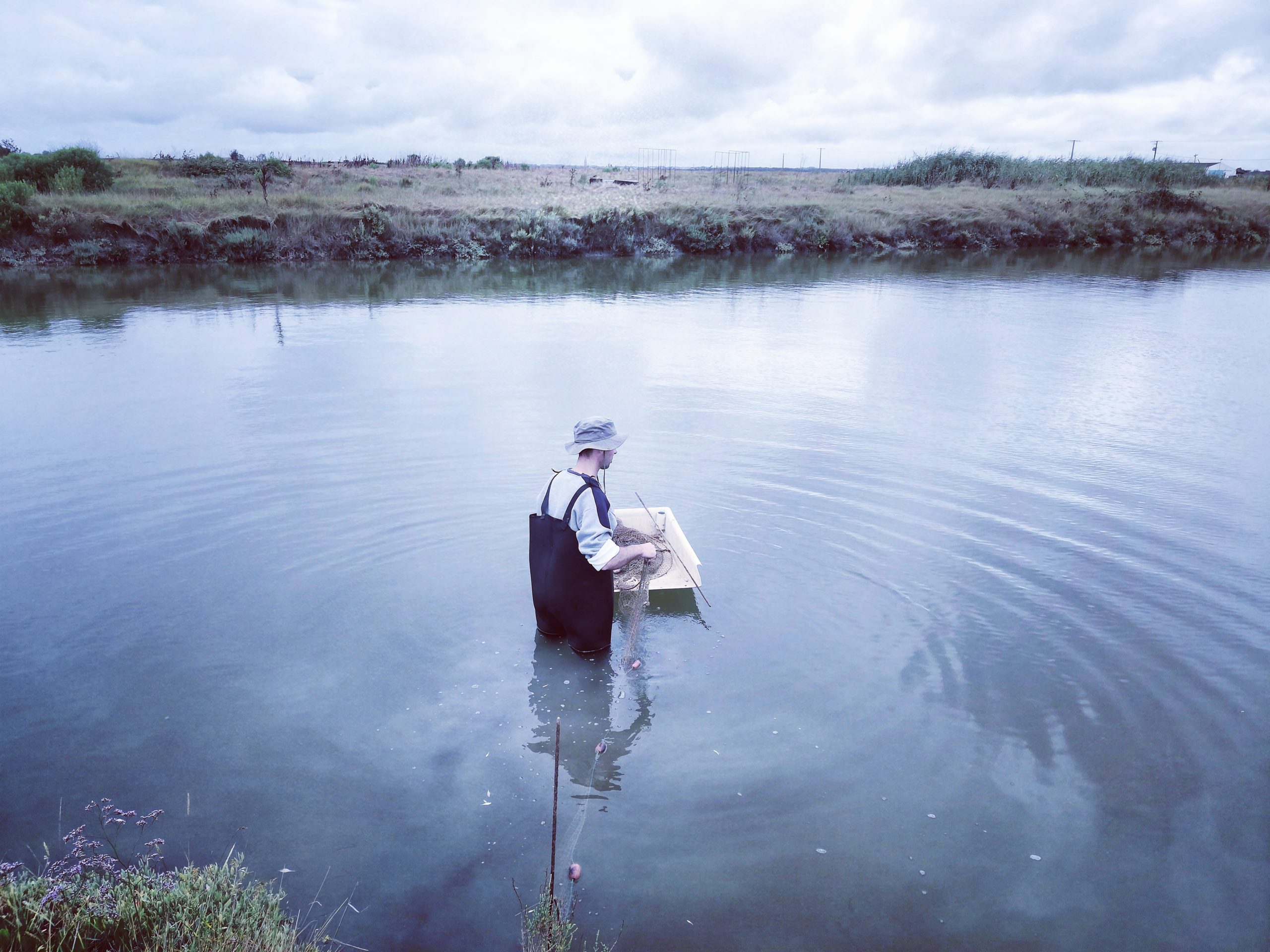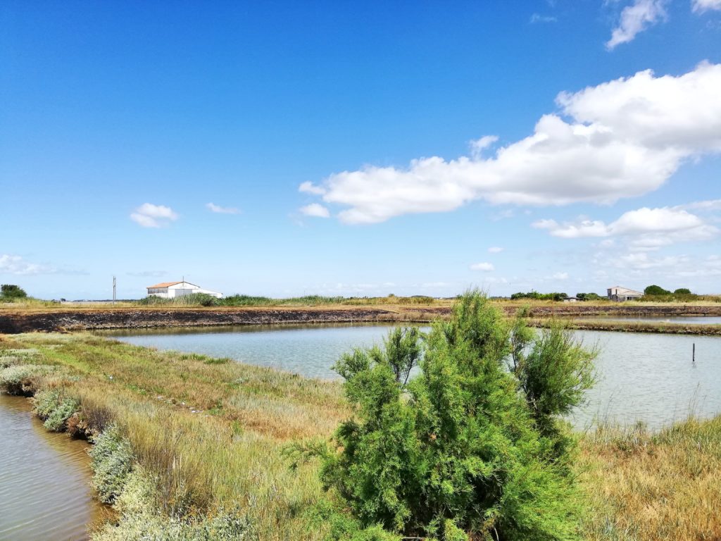 Pour rejoindre la Ferme Marine d’Artouan, il faut s’enfoncer dans de petits chemins blancs au cœur du marais charentais. Nulle âme qui vive à l’horizon, si ce n’est quelques mouettes et quelques vaches qui cohabitent sur ces terres marécageuses. Un décor de bout du monde. C’est en mai 2017 que David et Ingrid Mercier ont racheté cette ancienne exploitation ostréicole abandonnée. Le site de 11 hectares est constitué de 24 claires, soit 2,8 hectares de surface en eau entourés de lavande de mer, salicorne, moutarde sauvage, obione… : une biodiversité végétale que le couple prend soin de laisser s’épanouir, avec l’idée dans le futur de pouvoir valoriser certaines des plantes comestibles issues de la ferme. « On essaie d’intervenir le moins possible sur l’environnement de la ferme et la végétation », explique Ingrid Mercier.