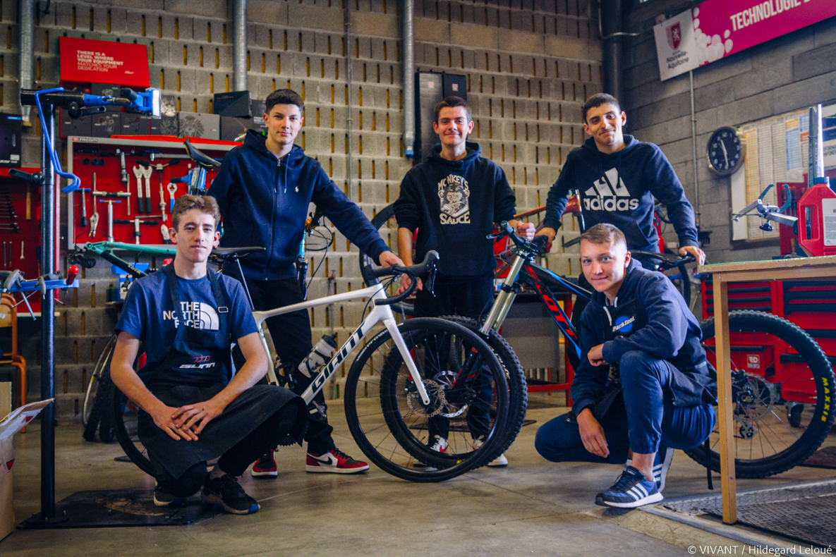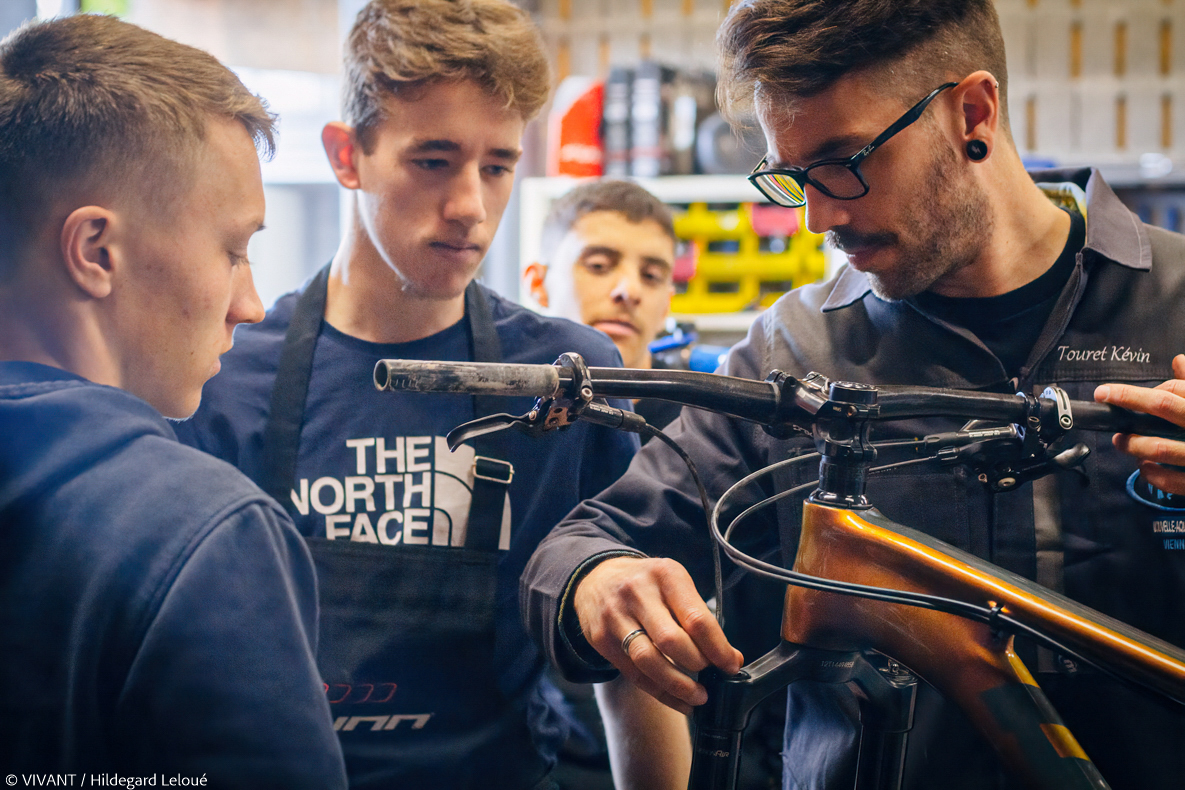 “Regardez, à la rotation des roues, on comprend que c’est la valve qui est obstruée” indique Kévin Touret, responsable de la formation conseiller technique cycle au CFA de Saint-Benoît. Autour de lui, cinq apprentis diagnostiquent un VTC prévu pour rouler lors de la Gravienne, une course départementale. Pendant un an, ces jeunes de 16 à 18 ans alternent entre les cours et le travail en entreprise, au rythme d’une semaine sur deux. “En plus de la mécanique, ils apprennent tout ce qui relève de la vente, de la gestion, de la connaissance des marques et du milieu sportif, énumère le formateur entre deux consignes. L’objectif, c’est qu’à l’issue de leur cursus, ils soient en capacité de gérer un atelier ou un magasin.” Les débouchés sont en effet multiples : mécanicien, cadreur-soudeur, vendeur, loueur, commercial et moniteur de vélo sont autant de métiers possibles, dans la filière du cycle.