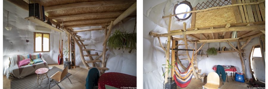 Un espace réduit, facile à réaliser et économique à chauffer, pas de loyer : le microhabitat a de quoi séduire. Après 10 ans en yourte, des expériences en tipi et en squat, Guillaume fut l’un des fondateurs en 2007 de la coopérative charentaise La Frênaie, spécialisée dans la fabrication de yourtes. Il a depuis passé la main mais milite activement au sein de l’association Habitats libres en Poitou. « Nous questionnons la manière dont on se loge en France. Nous souhaitons faire évoluer la culture de l’habitat léger : un habitat libre, affranchi des logiques de crédit, éloigné des banques, qui offre la possibilité d’être propriétaire. » Dans le nord de la Nouvelle-Aquitaine, les micro-habitats seraient « des centaines » , en bois, terre, paille, tissus, récupération. Tipis, yourtes, roulottes, mais aussi kerterres, zomes, géonefs… construits à partir de matériaux économiques et disponibles en grande quantité, qui n’impliquent pas de coûts de transformation et de transport exorbitants. Une vision à contre-courant de la construction classique, qui représente environ 40% des émissions de CO² des pays développés, 37% de la consommation d’énergie et 40% des déchets produits. La question des habitats sur des terrains parfois non-constructibles ? « La question du logement dépasse la notion de légalité : les habitats libres sont avant tout légitimes ! », soutient Guillaume de Salvert. Depuis l’adoption de la loi ALUR (Loi relative aux habitats non traditionnels, habitats mobiles et habitats démontables constituant l’habitat permanent de leurs utilisateurs), le cadre légal est plus favorable à l’installation.