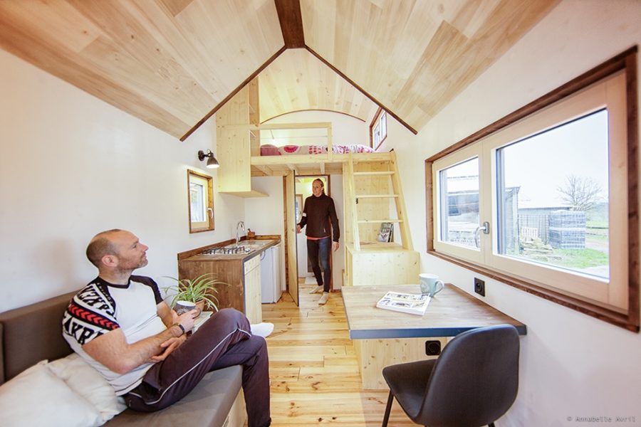 Conçus sur-mesure, les petits habitats mobiles de West Wood Tiny peuvent aller de 9 m² à 40 m². Mais selon leurs concepteurs, parler de surface au m² est un luxe très occidental. L’important c’est la fonctionnalité des espaces, pour répondre aux besoins essentiels : l’alimentation, l’hygiène et le sommeil. “C’est un autre mode de construire et d’habiter, au même titre que la paille. Maintenant la paille est devenue une technique courante, mais il a fallu un certain temps avant que cela rentre dans les mœurs. C’est la même chose avec l’habitat alternatif : aujourd’hui c’est encore un peu compliqué parce que beaucoup ne comprennent pas qu’on puisse vivre en yourte, en roulotte, et la législation peut être bloquante. Mais on peut habiter dans plus petit, ce qui rend l’impact environnemental et carbone beaucoup moins fort que quand on vit à deux dans une maison de 140 m², même si elle est aux normes actuelles passives”. Eddy Fruchard en est convaincu, il sera nécessaire de tendre vers des logements de plus en plus petits, déjà parce que les gens n’ont pas les moyens d’investir dans plus grand, mais aussi en raison de l’impact du foncier : “Plus on est nombreux et plus il faut d’habitat, or on le voit avec les lotissements, ça bouffe du territoire, des terres agricoles.” Selon lui, de plus en plus de personnes sont prêtes à vivre de cette façon-là.