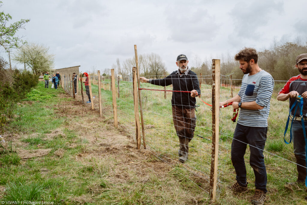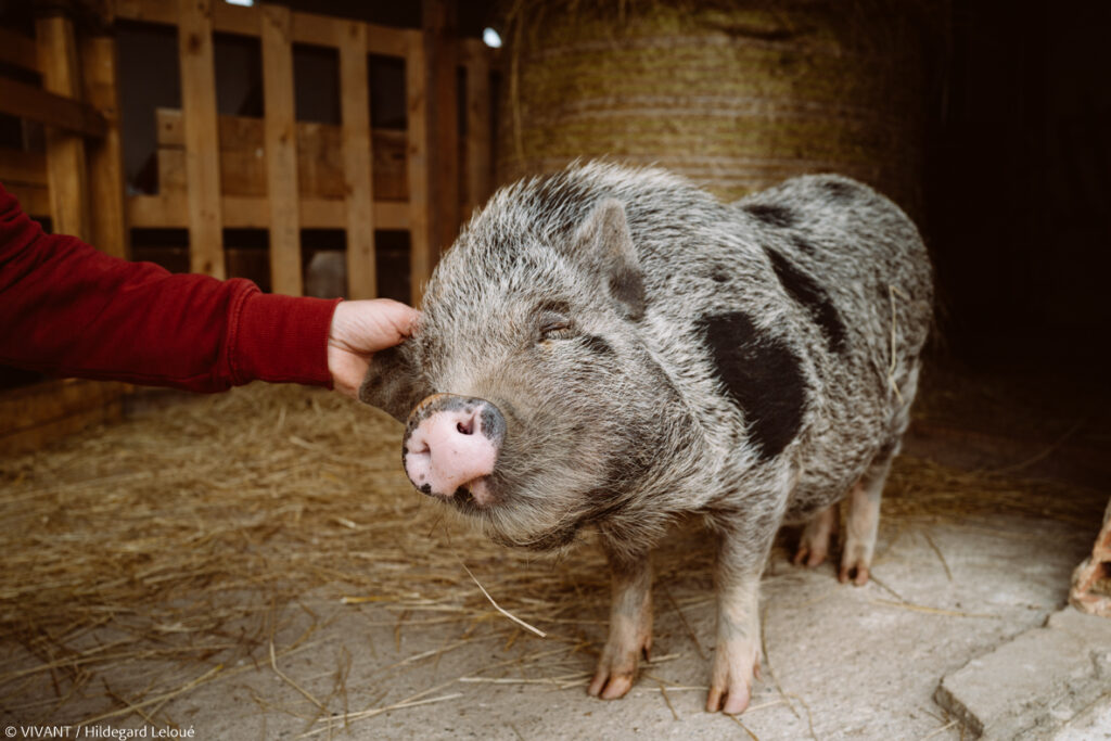 Cliquetis des pinces sur le métal. Comme chaque dernier samedi du mois, l’écolieu ouvre ses portes aux habitant·es du territoire qui viennent contribuer aux chantiers participatifs, en synergie avec les résident·es permanent·es et temporaires du lieu. L’objectif du jour : clôturer le périmètre de la mini-ferme pédagogique en construction, un espace destiné à accueillir cochons, ovins et autres animaux de la basse-cour. L’idée est d’en faire un lieu ressource pour le territoire, où tout un chacun pourra venir observer les animaux et profiter de leur présence ; y compris les jeunes en programme de remobilisation. “C’est le faire ensemble qui permet de se rencontrer, en prenant soin de la nature et des autres”, affirme Claire Jeauneau en caressant Babe, le cochon nain de l’écolieu. “Quand les garçons arrivent, ils ne savent pas toujours comment exprimer ce qu’ils ressentent. L’animal devient alors prétexte à la discussion : il permet d’établir un contact humain sans avoir à parler directement de soi.”