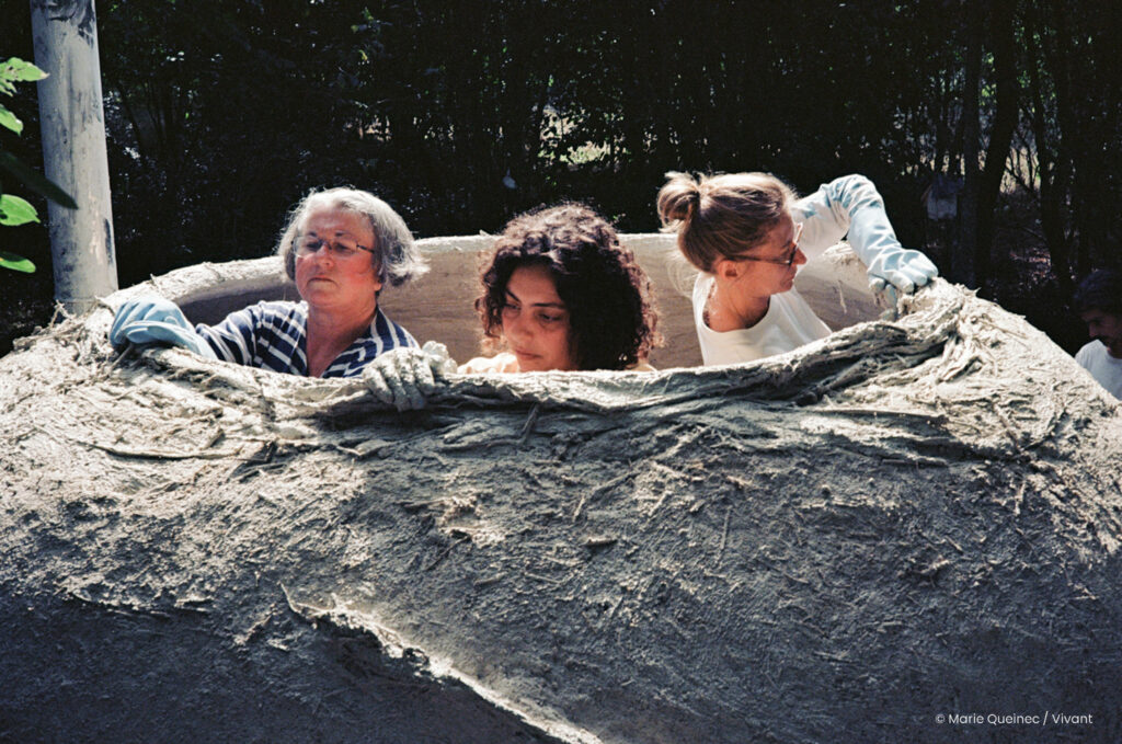 C’est Alba, la plus jeune fille de Dorothée Melis, qui a eu l’idée d’accueillir la construction de la kerterre sur le terrain de la famille. Créatrice de jeux vidéos, elle recherchait des décors, et lorsqu’elle a découvert l’existence de ces maisons atypiques elle s’est dit “bingo” ! Pour Elia, sa sœur aînée, qui participe aussi au stage de construction, l’intérêt de la démarche est évident : « Les gens sont pessimistes pour le futur, mais tu fais ce que tu veux du futur avec ce qu’il y a dans ta tête. Et si tu peux en mettre un peu en œuvre, c’est moins déprimant. On a monté une petite maison en 5 jours à 18 personnes, si c’est ça le futur, ça me va ! »