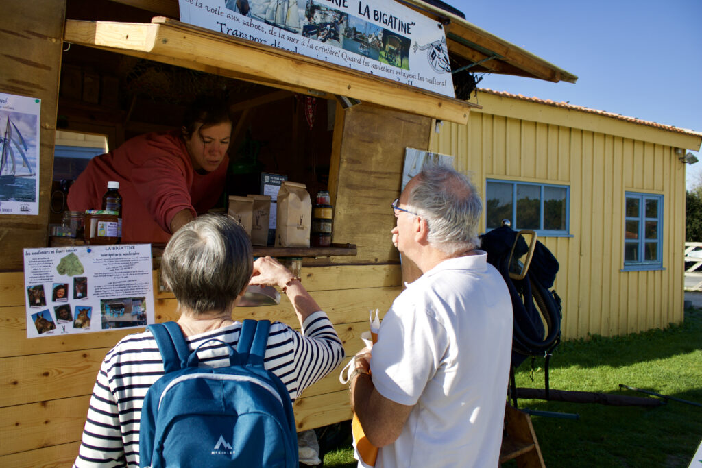 En cette matinée d’octobre, l’été joue encore des coudes avec l’automne et l’arrière-saison continue d’attirer des touristes sur l’île d’Oléron. Au lever du soleil, une dizaine de producteur·ices et créateur·ices du secteur s’installent au port des Salines et ne tardent pas à être rejoint·es par les client·es averti·es de ce marché confidentiel situé en plein cœur des marais, au sud de l’île. Face à la fromagère, un stand intrigue. On s’approche, on regarde, avant de se faire héler par Pierre-Jean Coppa, l’un des fondateurs de l’épicerie La Bigatine : « Eh oui messieurs-dames, c’est bien en voilier que sont importés nos produits« . Mais ce n’est pas la seule particularité : quatre mulets tractent cette épicerie itinérante, qui s’installe au fil des marchés sur l’île, pour des trajets 100% décarbonés.