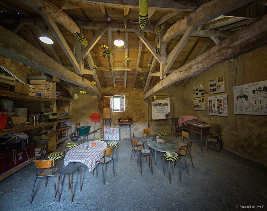 Vu l’état du château en 2007, la première aventure a été d’organiser des chantiers internationaux et des chantiers participatifs avec les bénévoles pour réhabiliter de premiers espaces où accueillir les habitants et leurs envies. La Colporteuse a notamment rejoint le réseau REMPART, association nationale pour la sauvegarde citoyenne et collective du patrimoine. La première pièce réhabilitée a aussitôt été convertie en bar associatif, où ont été organisées les premières soirées. Étape décisive pour la création d’un « lieu de vie, d’interactions et d’échanges qui peuvent être déclencheurs de projets communs » selon Mattieu Bernardin. En 2009, la jeune association signe une première convention avec la CAF et devient Espace de vie sociale. En 2019, elle est labellisée Centre socioculturel, ce qui lui permet d’amplifier son rôle d’animation du territoire. Aujourd’hui La Colporteuse compte 250 adhérents, 70% du territoire argentonnais, 20% de l’agglomération bressuiraise et 10% de toute la France : des habitants, des structures sociales (centres d’éducation renforcée, IME, centres médico-psychologiques…), des collèges, lycées, écoles, centres de loisirs, maisons de retraite… Et tous contribuent à la vie du lieu. « Soit il y a une figure imposée, une charpente à construire par exemple, soit les gens viennent et on leur dit de faire comme si c’était chez eux, on fait le tour du site et on leur demande ce qu’ils ont envie d’améliorer. » Un groupe du centre médico-psychologique de Bressuire, qui vient une demi-journée par semaine depuis cinq ans, a ainsi réalisé de A à Z une barrière en châtaignier à proximité des douves. « L’idée est bien d’accueillir tout le monde ! Et quand l’envie d’une personne ou d’un groupe de personnes est réalisable, on essaie de la mettre en place et d’en faire un projet à partager avec la population locale. » C’est comme ça qu’ont été créés des ateliers bricolage, couture, des animations nature, un jardin en permaculture, des festivals, une ludothèque, un concours de la soupe, un four à pain, et mille autres idées devenues réalité. Dont une miellerie associative et un rucher école, à l’initiative de deux apiculteurs qui ne voulaient plus extraire leur miel chacun dans son garage. On franchit la porte de la miellerie avec Mattieu Bernardin et Lolita Favreau. Elle s’occupe du pôle Biodiversités de la Colporteuse.