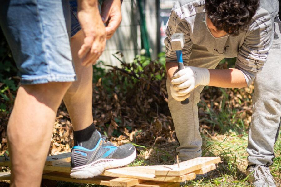 Deux retraité·es sont présent·es ce jour-là dans le jardin de l’ITEP pour accompagner les jeunes dans leurs réalisations. Ethan, 12 ans, change le papier de la ponceuse et s’apprête à donner une nouvelle vie à une table. « Tu dois juste l’effleurer avec la ponceuse, sans trop appuyer » conseille Véronique. A 62 ans, cette « écolo de base » est bricoleuse et amatrice de couture. Elle s’investit dans ces ateliers pour « essayer d’utiliser son temps libre à bon escient. » « C’est bien, tu te débrouilles comme un chef ! » lance-t-elle à Ethan, un grand sourire aux lèvres. À ses côtés, Lucas enfonce maintenant des clous avec un marteau. « Magnifico ! » complimente Pierre. Les encouragements sont légion pour soutenir les deux jeunes de l’atelier, qui peuvent avoir des difficultés à se concentrer. Si Pierre a été attiré par Les Héritiers de la Récup, c’est pour « la diversité des objectifs. Il y a bien sûr la transmission, mais aussi l’aspect écologique, éducatif, intergénérationnel. Le tout avec des publics différents, c’est ce qui fait la richesse de cette association. Avec ce groupe de l’ITEP, nous en sommes au troisième atelier. Au premier, ils avaient du mal à rester concentrés. Maintenant, c’est plus concret, ils voient que ça avance. C’est passionnant et très enrichissant » confie-t-il. Les chaises, la table et la jardinière ont été confectionnés par ces bricoleurs en herbe. Place maintenant à la peinture.