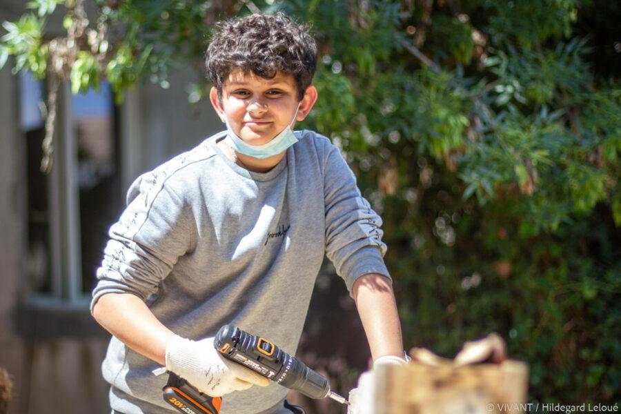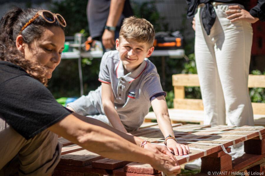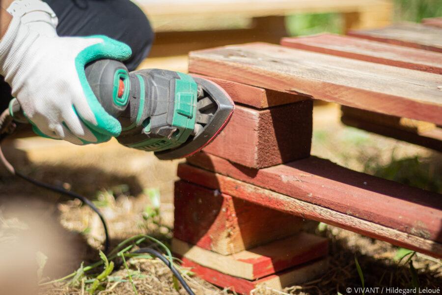 Les gants blancs sont soigneusement enfilés avant de saisir la visseuse. Le regard déterminé, Lucas, 12 ans, s’applique à enfoncer les tiges de métal dans des morceaux de bois de palettes. Sous un généreux soleil printanier, le chantier du jour consiste à créer le salon de jardin de l’ITEP (Institut thérapeutique éducatif et pédagogique) d’Aytré, dans l’agglomération de La Rochelle. « Les jeunes sont allés récupérer les palettes auprès de restaurateurs qui s’en débarrassaient. Il y a une démarche pédagogique autour du réemploi, avec l’idée qu’ils créent leur propre lieu de détente et le respectent » souligne Alexandra Ribeiro, monitrice-éducatrice au sein de cet institut qui prend en charge des jeunes ayant des troubles du comportement. Lucas travaille sous l’œil avisé de Pierre, bricoleur expérimenté. Cet instituteur à la retraite a répondu à l’appel des Héritiers de la Récup, une toute jeune association créée en mars 2021. À l’origine de cette initiative, quatre motivé·es d’une vingtaine d’années : Maëlle Errard, Louis Mirande, Leïla Barcellini et Baptiste Turbé. « Notre objectif est de créer du lien social entre les générations autour du réemploi, du zéro déchet. Nous organisons des ateliers de bricolage, couture et jardinage dans lesquels les seniors transmettent leur savoir-faire aux plus jeunes. C’est l’occasion de donner une seconde vie à des matériaux tout en passant un bon moment ! » explique Maëlle Errard, la coordinatrice.