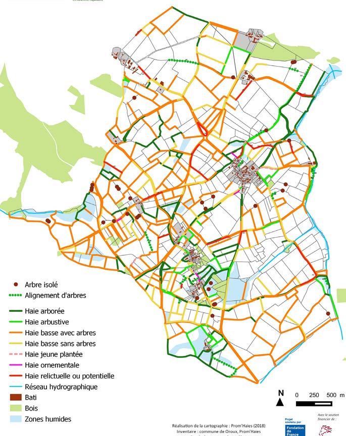 C’est Prom’haies qui a été choisi pour coordonner le projet. Avant Oroux, cette association avait eu l’occasion d’accompagner des communes dans l’inventaire des haies, mais jamais de façon participative, et jamais avec une méthodologie aussi poussée. Pour cette action, Prom’haies a en effet créé une grille de notation très précise permettant de déterminer de façon scientifique les haies à sauvegarder. « Nous avons construit une grille de relevé en fonction des trois enjeux d’intérêt général : la biodiversité, la qualité et l’écoulement de l’eau, et le paysage au sens patrimonial » explique Carole Malherbe, chargée d’étude et de communication de l’association. Après une demi-journée de formation, dix habitants volontaires ont chaussé des bottes, pris stylo et blocs-notes et ont relevé 90 km de linéaires. Au final, il a été établi que 64 km de haies devaient être protégés, ainsi que l’intégralité des 32 arbres isolés de la commune. La mesure est effective depuis 2019.