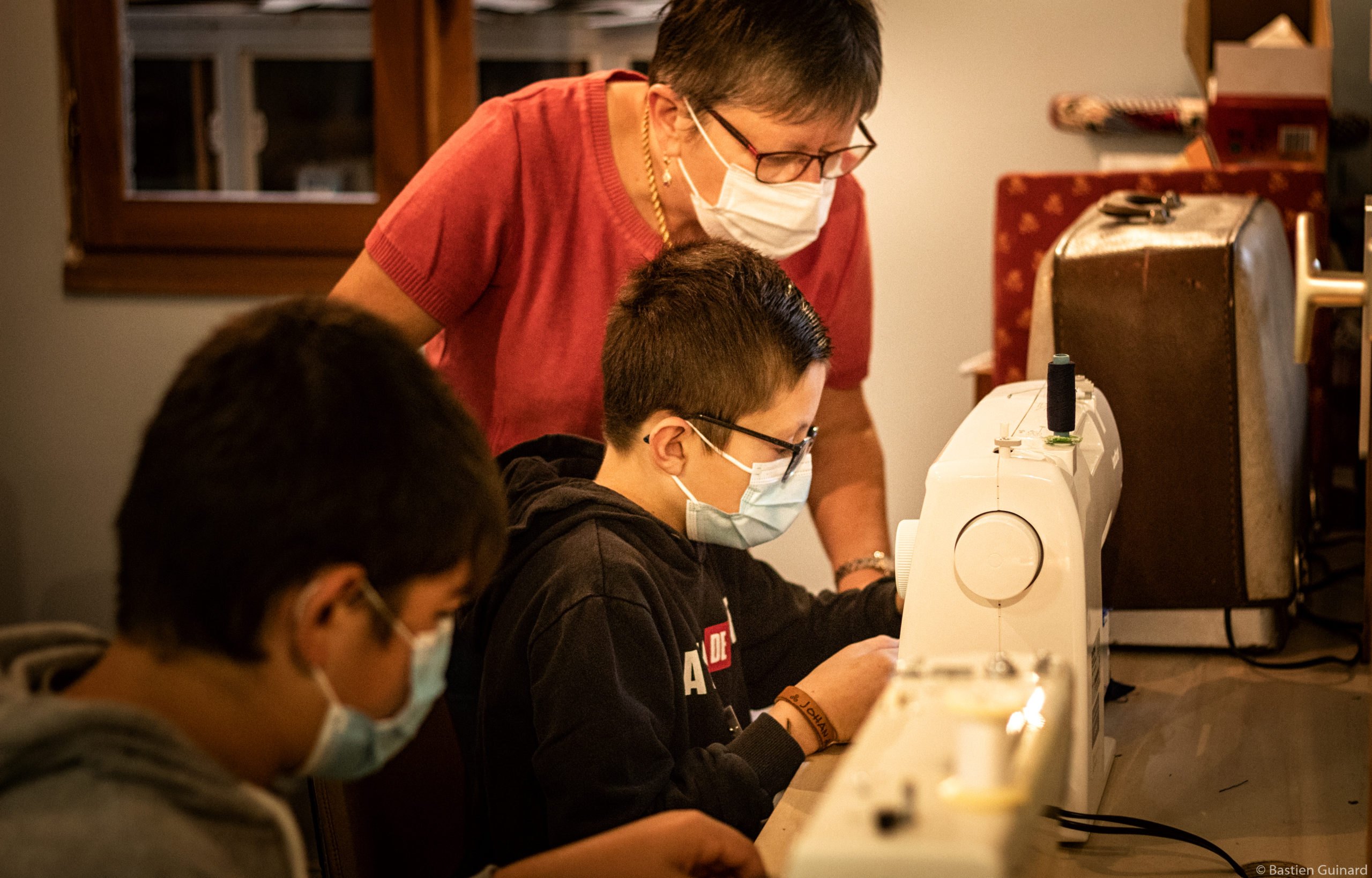 A quelques mètres, Christine enseigne les bases de la couture à Johan : coudre un bouton, coudre à la main, faire les points de base, et bien sûr utiliser la machine à coudre, car c’est ce que les enfants préfèrent. « Je pense que toutes les générations devraient transmettre aux jeunes leurs savoir-faire. D’abord c’est toujours utile de découvrir des métiers. Et plus on a de connaissances, mieux c’est dans la vie. » A 63 ans, elle a travaillé en confection dans la lingerie pendant 20 ans à Saint-Loup-sur-Thouet et dans le prêt-à-porter haut-de-gamme à Bressuire. Très pédagogue, elle explique à Johan : « Là, tu vas suivre ton tissu au bord du pied de biche, tu t’arrêteras à un centimètre, tu plantes ton aiguille, tu soulèves le pied, tu pivotes et tu repars, ok ? Ne retiens pas ton tissu, tu le guides, tu vas doucement ! Ne regarde pas ton aiguille, regarde ton bord ! »
