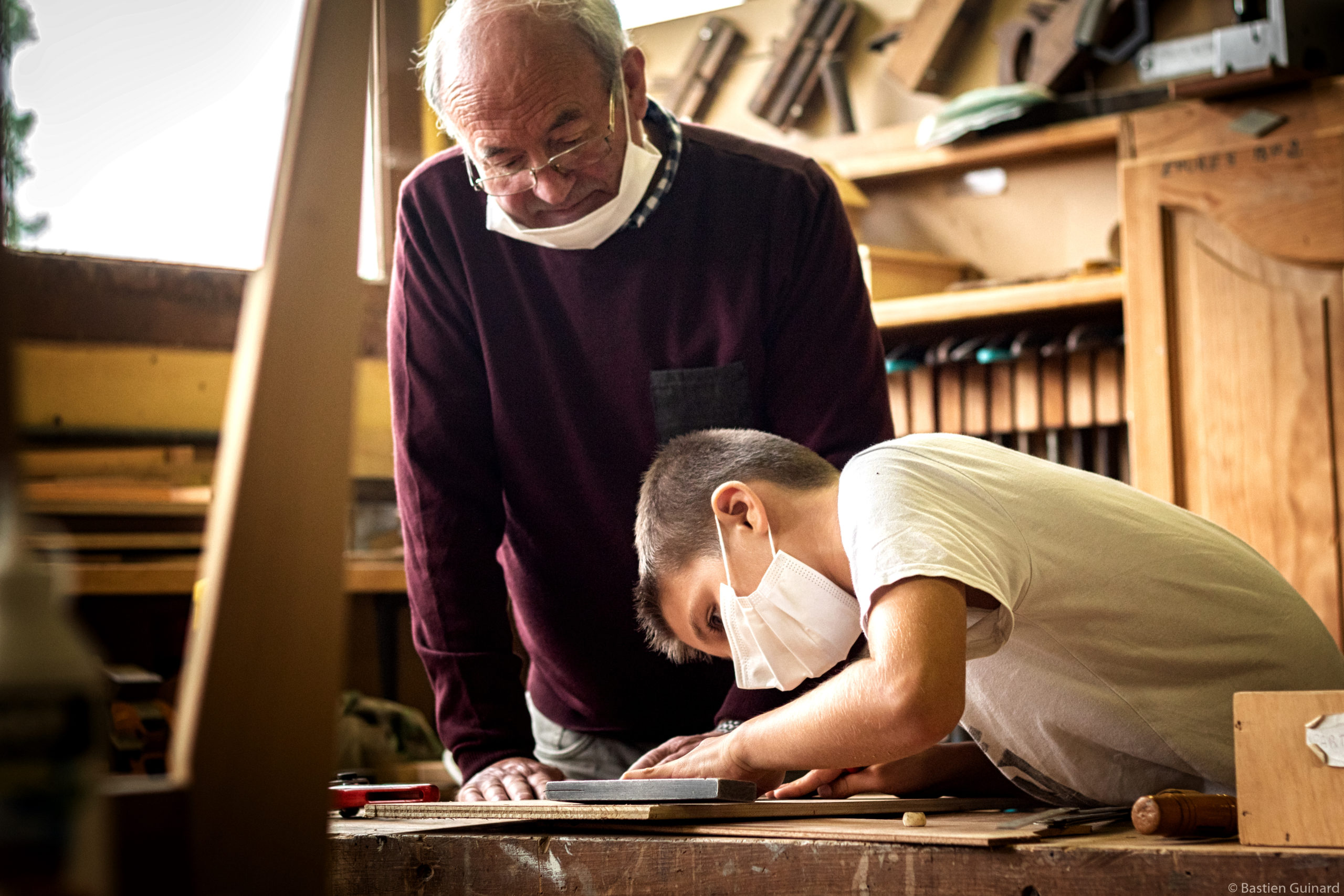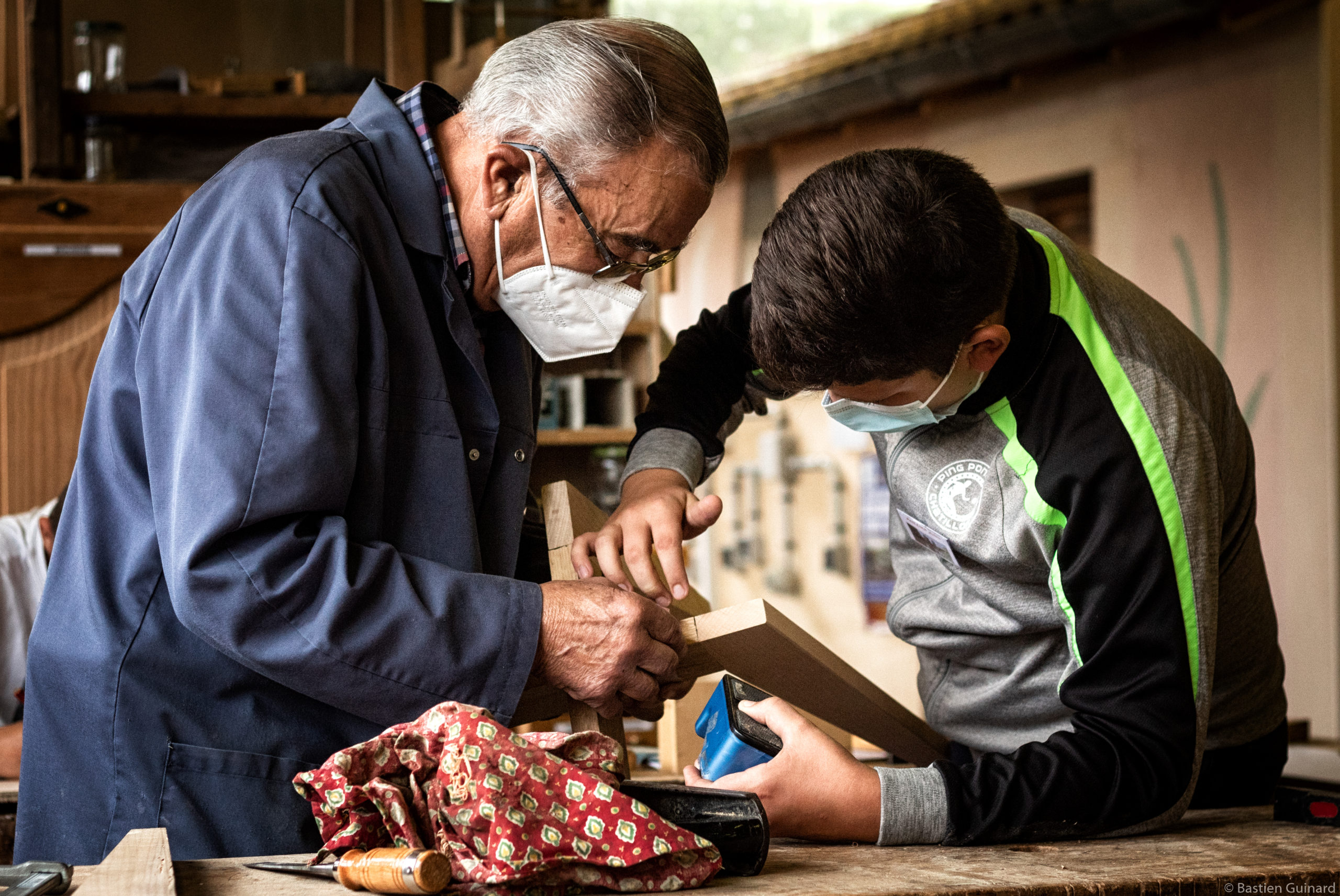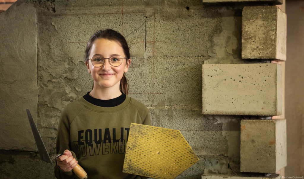 Ce matin-là, Jules et Bastien retrouvent Jean-Michel à l’atelier menuiserie pour terminer le piétement des tabourets qu’ils sont en train de fabriquer. Ils en réaliseront l’assise quand ils rejoindront l’atelier ébénisterie. Jean-Michel Jouneau, 78 ans, ancien menuisier-charpentier, les aide à utiliser maillet et ciseau à bois, et apprécie : « Ça se passe bien avec tous ces jeunes, ils nous apportent de l’amitié, de la convivialité, et c’est agréable de voir qu’ils s’intéressent aux métiers du patrimoine. » Même satisfaction pour Jean-Marie Parnaudeau, maçon, qui a appris à Louise, 12 ans, à manier la truelle et le fil à plomb pour monter des murs en parpaing :