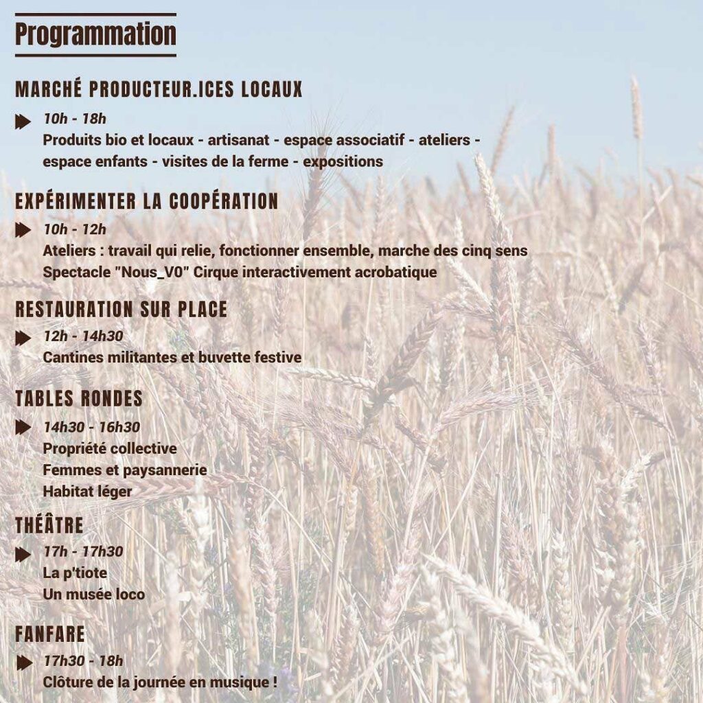 Premier événement organisé : un week-end autour des nouvelles formes de paysanneries, les 17 et 18 juin. Le samedi 17 sera consacré aux fermes collectives, avec des ateliers et échanges portant sur les outils de coopération, les montages juridiques ou encore l’équilibre des rythmes personnels et collectifs. Le dimanche 18 juin sera ouvert à tous, avec au programme un marché de producteur.ices locaux, des tables rondes et des spectacles.