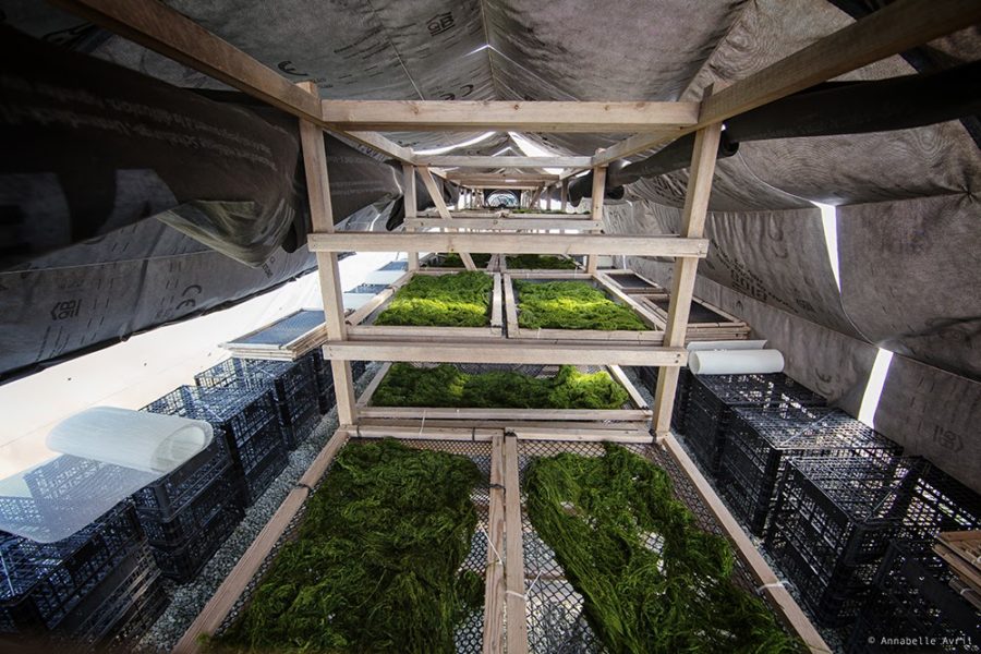 En 2015, la récolte d’algues fraîches était de l’ordre de 5 tonnes, elle était de 23 tonnes en 2016 pour atteindre 72 tonnes en 2019, “pas parce qu’on fait de l’extraction plus dense, précise Tanguy Gauvin, mais parce que grâce à notre travail le milieu est beaucoup plus riche.” Lorsqu’elles sont rapportées de l’océan, elle sont lavées puis déshydratées sur le site d’exploitation “terrestre” d’Algorythme. Visite et et explication du process avec Hélène Jouannet :