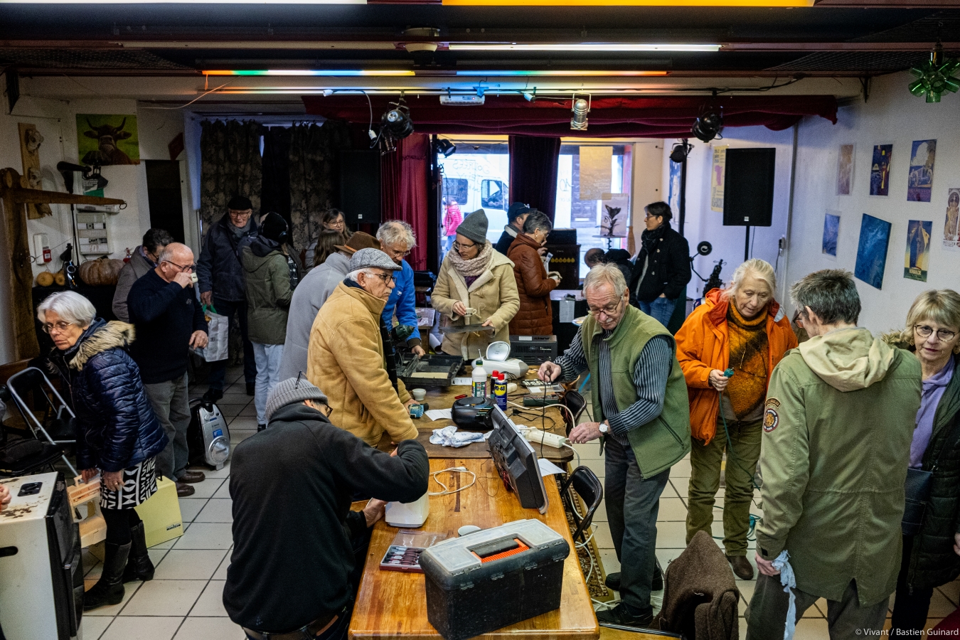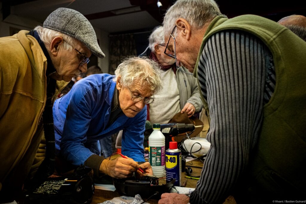 C’est l’affluence en ce début d’après-midi au Rouge Gorge à Parthenay. Une quinzaine de personnes attendent leur tour pour rejoindre, avec leurs objets défectueux, les tables centrales où les réparateur·ices bénévoles s’activent déjà. C’est la première fois que Serge, 81 ans, franchit la porte du Rouge Gorge, qu’il a découvert par le bouche-à-oreille. Il est venu avec son aspirateur dont le cordon est cassé. « Si c’est possible de faire réparer plutôt que d’envoyer à la déchetterie, c’est aussi bien. C’est pour empêcher la pollution et tout ça. Si on balance on ne sait pas ce que ça peut devenir. » Première fois aussi pour Jacky qui lance avec amusement : « Sauvons la planète… et mon radio CD ! Surtout mon radio CD, parce que sauver la planète, c’est quand même une autre dimension ! »