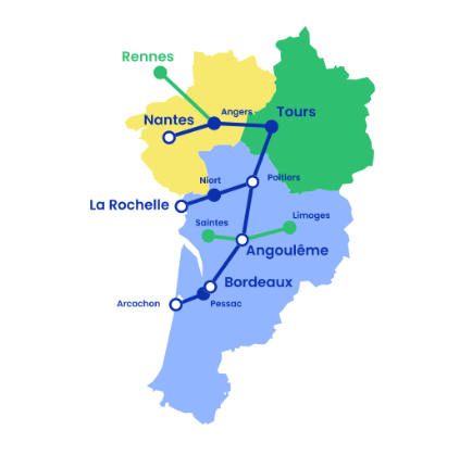 Le Train va permettre de desservir 11 villes du Grand-Ouest via 10 rames grande vitesse de 350 places chacune. Il sera, par exemple, possible de relier Bordeaux et Nantes en 3h seulement, au lieu de 4h15 actuellement. Aujourd’hui, ce trajet s’effectue soit en passant par la côte atlantique, soit par une correspondance Bordeaux-Paris suivie d’un Paris-Nantes. Ici, Le Train va chercher à se limiter à l’essentiel en proposant de relier les deux destinations via Tours, plutôt que de passer par la capitale. Cela permettra aux voyageurs de gagner plus d’1 heure de trajet tout en restant dans le même train. Dans cette même idée, nous allons également proposer un nouveau service pour faire Angoulême-Arcachon sans correspondance à Bordeaux. Autre exemple : entre Bordeaux et Angoulême, ce sera désormais 40 minutes de trajet au lieu d’une heure. En tout, Le Train va permettre de réaliser une cinquantaine de dessertes supplémentaires par jour.