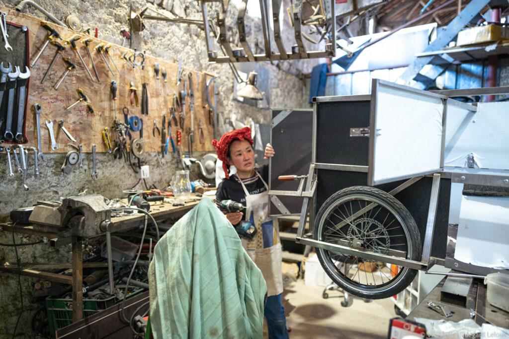 Cet été, Ayako est venue de Bretagne pour la construction d’une remorque-cuisine en inox. « Je veux cuisiner dans la rue et comme je n’ai pas de local, j’ai besoin de transporter toute la nourriture dans des boîtes Isotherm pour conserver à température. La partie haute de la remorque est démontable ; j’ai installé un évier et un robinet, je peux mettre une bouteille de gaz. C’est plus que parfait !«